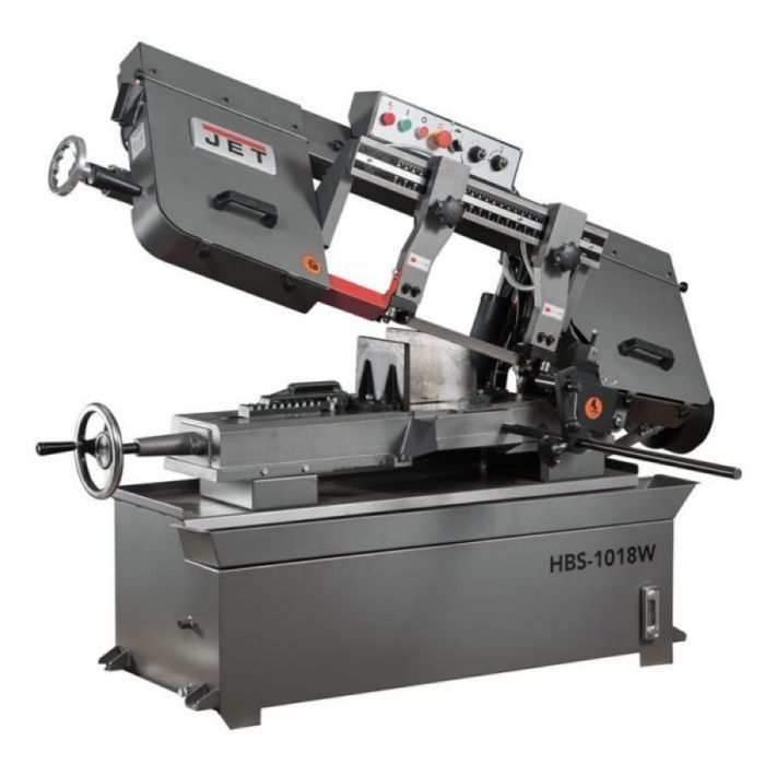 Ленточнопильный станок Jet HBS-1018W - представляет собой традиционную модель промышленного оборудования, применяемого для серийного производства. Модель имеет конструкцию американского типа. Тяжелая литая консоль и большие механические тиски позволяют выполнять пиление металлических заготовок большого диаметра. Пиление под прямым углом допускает максимальный диаметр заготовки в 250 мм. Под углом в 45 0 станок способен осуществлять распил заготовок диаметром 190 мм. Особенность конструкции станка HBS-1018W заключается в возможностях осуществлять распил прямоугольных заготовок. Допускаемое сечение обрабатываемой заготовки составляет 250х415 мм.