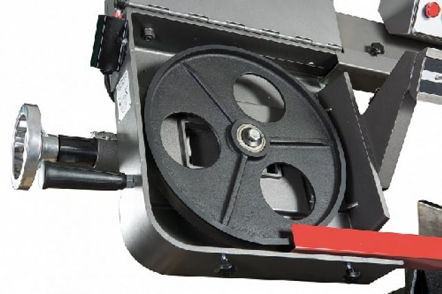 Моторная группа состоит из мощного электродвигателя - 1,5 кВт, обеспечивающего стабильную работу ленточного станка в различных скоростных режимах. Ременная передача позволяет осуществлять пиление заготовок на скоростях движения ленточного полотна в 25,40,50 и 70 м/мин. Управление работой станка осуществляется с пульта управления, установленного на консоли. Оборудование оснащено кнопкой аварийной остановки.