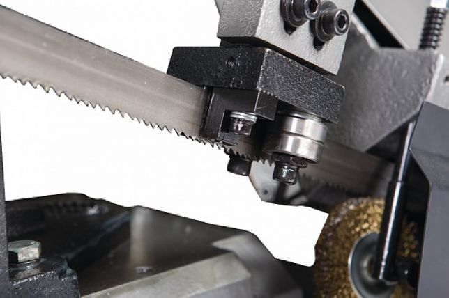 Модель HBS-1018W имеет управляемые направляющие, позволяющие осуществить регулировку прохода ленточного полотна в зависимости от формы заготовки и ее диаметра. Наличие направляющих предотвращает возникновение вибрации полотна, уход полотна в сторону. Направляющие укомплектованы 5 подшипниками и сухарями, осуществляющими позиционирование полотна непосредственно под прямым углом к поверхности обрабатываемой заготовки. Качество пиления обеспечивается подачей СОЖ в зону резания. Сила натяжения полотна обеспечивается поворотом маховика, установленного в левой, торцевой части консоли.