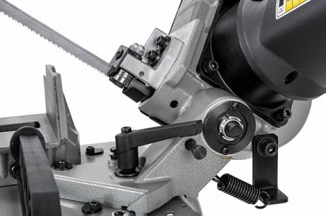 Работу станка обеспечивает экономичный электродвигатель мощностью 1,1 кВт. Особенность данной модели заключается в наличии плавной регулировки скорости движения полотна. Частотный преобразователь позволяет варьировать скорость движения ленточной пилы в диапазоне 30-80 м/мин. Точность распила достигается наличием направляющих, поддерживающих полотно в вертикальном положении. Направляющие свободно передвигаются по раме, регулируя диаметр распила и сокращая увод полотна. Для повышения точности распила станок имеет подшипники, установленные в направляющих. Сила натяжения пилы регулируется вручную, маховиком, расположенного в левой части рамы.