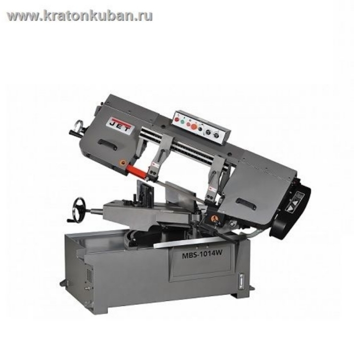Ленточнопильный станок Jet MBS-1014W - представляет модель американского типа, используемую для промышленного производства. Особенность станка заключается в наличии поворотной пильной рамы, обеспечивающей пиление заготовок под разными углами. Угол поворота консоли составляет 45 0. Допустимый диаметр обрабатываемой заготовки под углом 90 0 составляет 250 мм. Установка пильной рамы под углом 45 0 позволяет вести обработку заготовок диаметром до 225 мм. для получения необходимого угла распила, конструкция станка оборудована механическими тисками. Перестановка губок тисков позволяет добиться оптимального положения заготовки для последующей обработки. Опускание и поднятие тяжелой пильной рамы обеспечивается работой системы гидроразгрузки, облегчающей работу оператора. Гидроцилиндр позволяет регулировать скорость подачи пильной рамы в рабочую зону, установить необходимую силу прижима ленточного полотна на обрабатываемую заготовку.