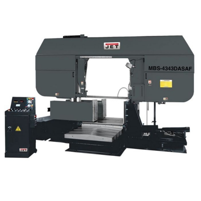Ленточнопильный станок Jet MBS-4343DASAF - является ленточнопильным станком промышленного типа, применяемая для пиления круглых заготовок большого диаметра, прямоугольных заготовок с большой площадью сечения. Перемещение консоли по вертикали осуществляется по двум колонам – направляющим. Процесс обработки заготовок выполняется в полуавтоматическом режиме. Управление всеми технологическими процессами осуществляется с пульта управления станком. Работу всех систем и узлов станка обеспечивает система гидравлики, включая подачу пильной рамы в рабочую зону, поднятие консоли по окончанию резания. Подвижный моторизованный стол подаёт заготовку в зону резания. Система оборудована контролем давления консоли на обрабатываемую заготовку, рассчитываемую в зависимости от типа заготовки и жесткости материала. Конструкция предназначена для обработки заготовок под прямым углом. Максимально допустимый диаметр заготовок, обрабатываемых на станке, составляет 1100 мм.