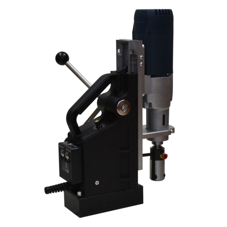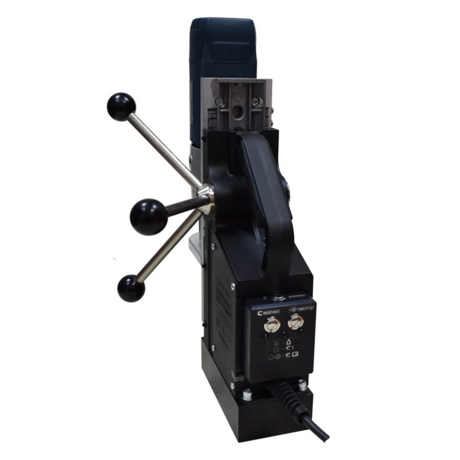 Он оснащен электроприводом Резекненского Акционерного Общества REBIR с конусом Морзе 2 и мощностью 1700Вт. Это компактный переносной инструмент для сверления отверстий диаметром до 45 мм и нарезания сквозной или глухой резьбы в стальных балках, листах или трубах. Данный магнитный сверлильно-резьбонарезной станок позволяет нарезать резьбу до М20 без применения дорогостоящих реверсных муфт и, даже, без резьбонарезного патрона. При недостаточной прижимной силе (в случае если станок стоит на немагнитной поверхности или листе тоньше 10 мм) красный световой индикатор мигает. Если температура электромагнита приближается к критической, начинает звучать сигнал с периодичностью 1 раз в 5 сек. При достижении критической температуры начнет моргать красный светодиод и частый звуковой сигнал (2раза в 1сек), сразу отключается электропривод, а через 40 секунд произойдет отключение магнита.