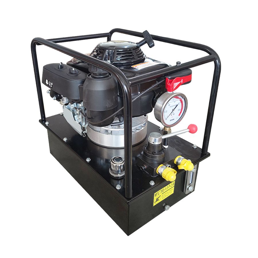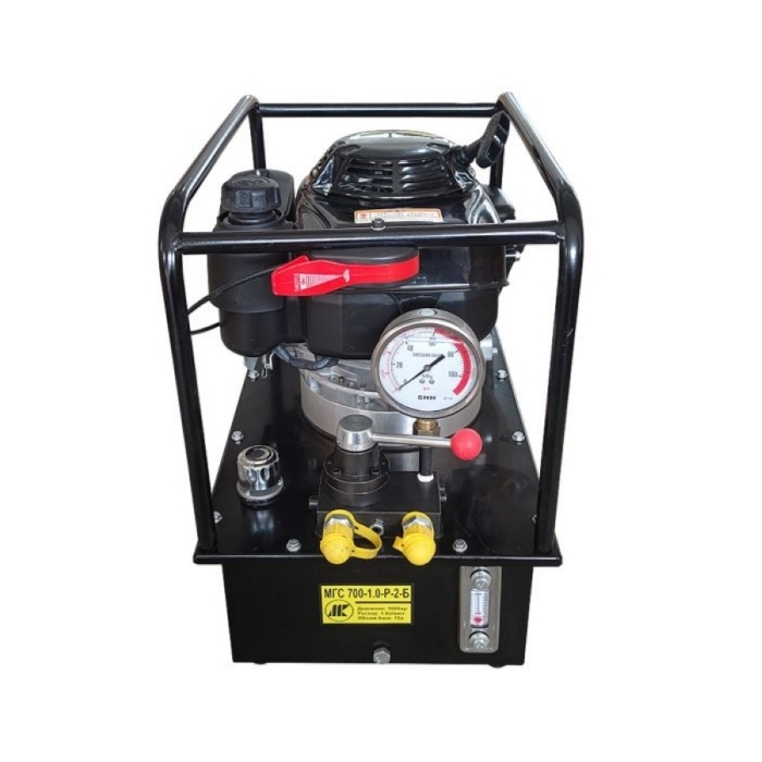Гидравлическая маслостанция МГС 700-1.0-Р-2-Б оснащена ручным распределителем с подключенными к нему через быстроразъемные соединения рукавами высокого давления. На маслостанции установлен виброустойчивый глицеринонаполненный манометр со шкалой до 1000 бар. В качестве рабочей жидкости используется гидравлическое масло "ВМГЗ" или масло с аналогичными характеристиками.