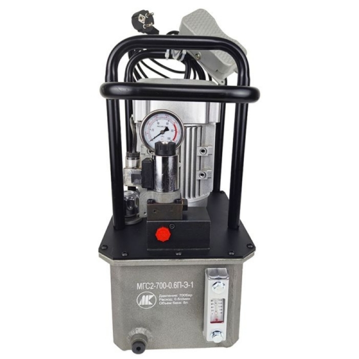 Маслостанция МГС2-700-0.6П-Э-1 - питается от сети 220В, в её арсенале есть пульт, с двухпозиционным электромагнитным распределителем одностороннего действия. Производительность этой станции: холостой ход (до 25 бар) - 3,5 л/мин, а при давлении до 700 бар - 0,6 л/мин. Также здесь есть, автоматический обратный ход