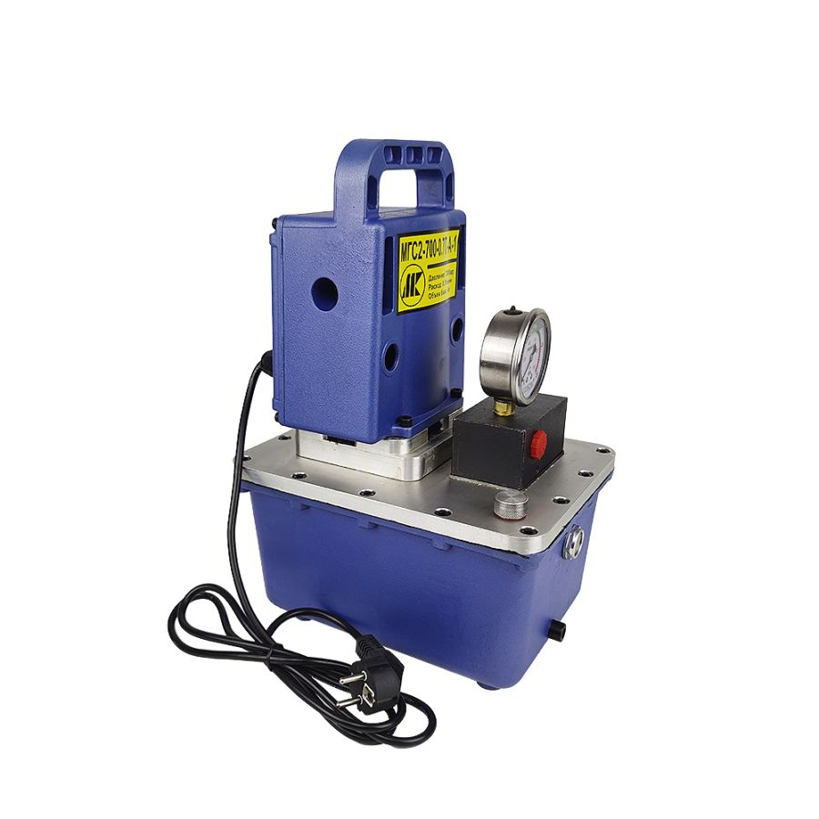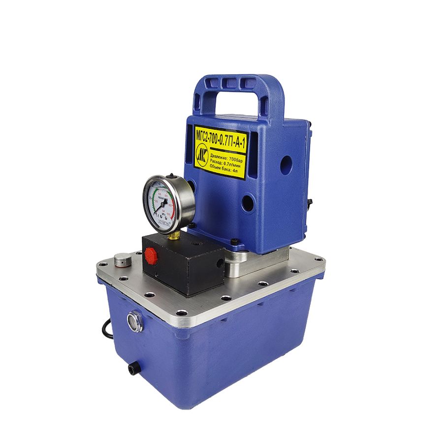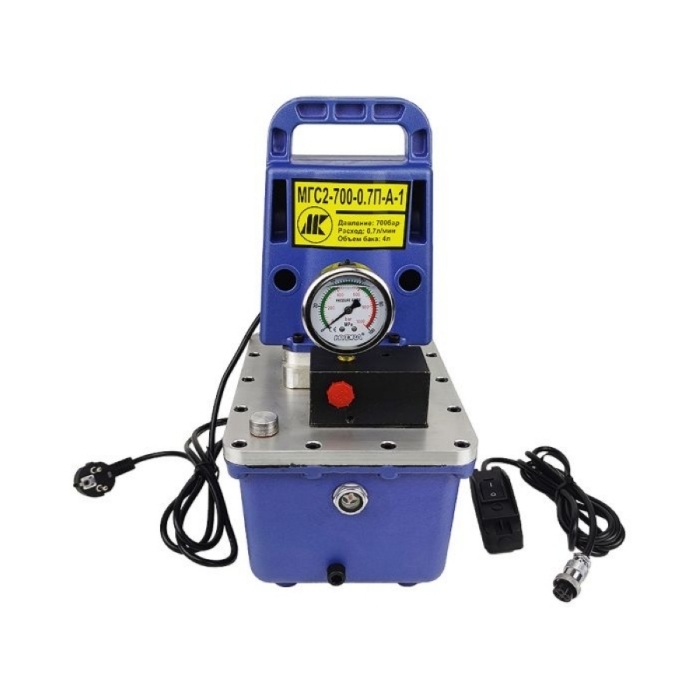 Маслостанция МГС2-700-0.7П-А-1 - это однопоточная станция с пультом используется в качестве привода для опрессовщиков наконечников, шинодыров, шиногибов, шинорезов, прессов, кабелерезов и любого другого инструмента, не требующего удержания давления при остановке подачи масла. Гидравлическое устройство имеет функцию с автоматическим обратным ходом при отпускании кнопки пульта. Производительность 0.7 л/мин, давление до 700бар, 220В, 750Вт
