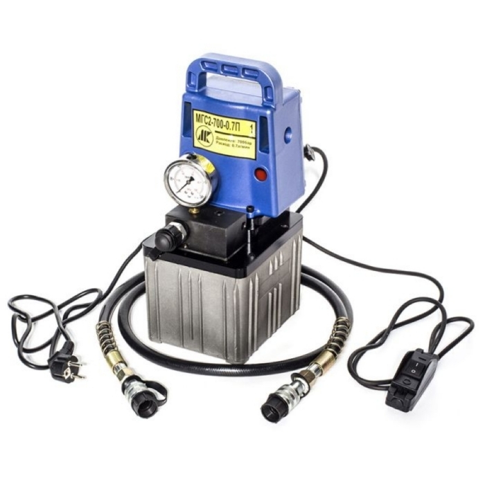 Маслостанция МГС2-700-0.7П-Э-1 - питается от сети 220В, с педалью и двухпозиционным электромагнитным распределителем одностороннего действия. Производительность этой станции: холостой ход (до 25 бар) - 3,5 л/мин, а при давлении до 700 бар - 0,7 л/мин. Также здесь есть, автоматический обратный ход