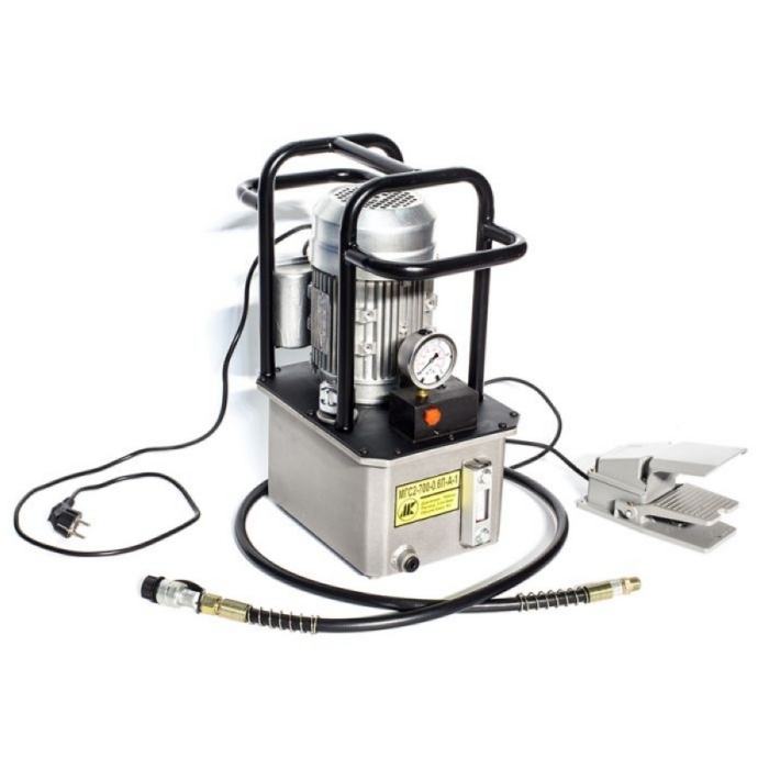 Маслостанция МГС2-700-0.6П-А-1 - 380В, с педалью и автоматическим обратным ходом при отпускании педали, двухпозиционным распределителем одностороннего действия. Производительность станции: холостой ход (до 25 бар) - 3,5 л/мин, а при давлении до 700 бар - 0,6 л/мин. Также здесь есть, автоматический обратный ход.