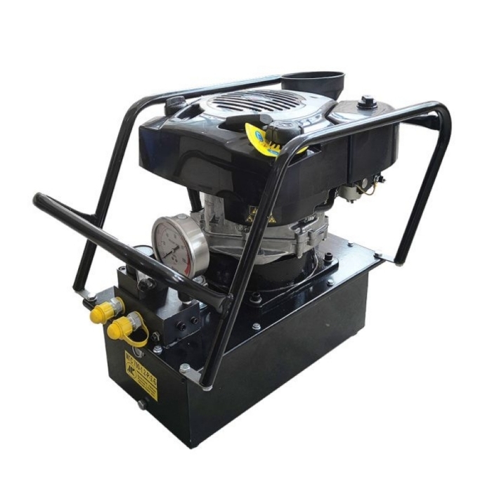 Двухпоточная маслостанция МГС700-2.2-Р-2-Б с бензоприводом и ручным распределителем, РВД 1.8м. Давление 700 бар, производительность 2,2 л/мин, объем бака 12 л. Маслостанция МГС700-2.2-Р-2-Б используется в качестве автономного привода для домкратов, прессов и другого оборудования с гидравлическим возвратом штока. Оснащена ручным распределителем с подключенными к нему через быстроразъемные соединения рукавами высокого давления. На маслостанции установлен виброустойчивый глицеринонаполненный манометр со шкалой до 1000 бар.