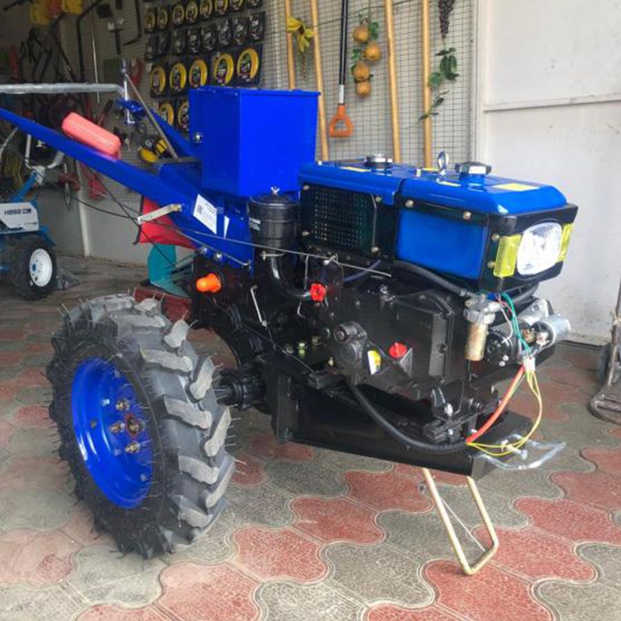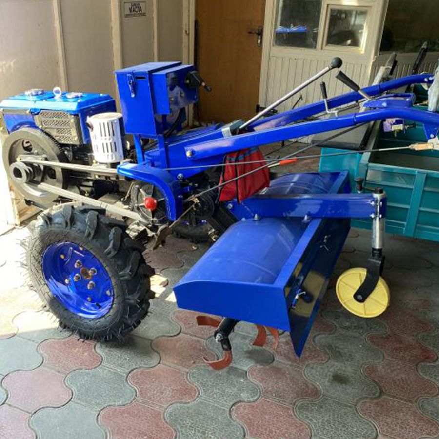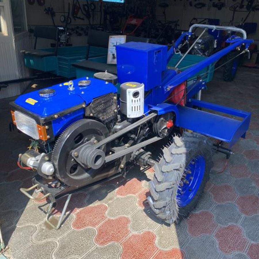 Мотоблок дизельный с водяным охлаждением Tehnotek D195E оборудован дизельным двигателем 195N мощностью 15 л.с.670 куб.см. Запуск двигателя производится при помощи ручки стартера и с электростартера. Аппарат подойдет для обработки земельных участков территорией до двух гектаров. В комплекте, плуг, сиденье, фара и активная почвофреза - ширина фрезы 1000мм, а так же, стоит отметить, что мотоблок подключается на задний шестеренчатый вал отбора мощности. Дизельный мотоблок 195E имеет возможность подключения нескольких типов различных навесных агрегатов и оборудования. Также эта модель оборудована ременным валом отбора мощности к которому можно подключать роторную сенокосилку. Можно данный мотоблок использовать для перевозки грузов при помощи прицепа массой до 450 кг. Разблокировка дифференциалов колес значительно облегчает управление аппаратом.
