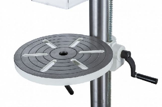 Массивный чугунный стол круглой формы имеет радиальные прорези для установки тисков (поставляются в комплекте) и может вращаться вокруг своей оси. Поворотный кронштейн обеспечивает наклон в обе стороны для сверления под углом и регулируется по высоте при помощи зубчато-реечного механизма. Рабочая область с прорезями есть и на основании станка, что позволяет работать от него, в этом случае расстояние до шпинделя будет достигать 1244 мм. Колонна, кронштейны, стол и прочие образующие конструкцию детали выполнены массивно и прочно, с расчетом на большие усилия при подаче сверла.