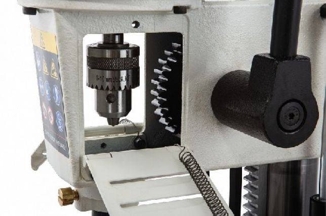 JBM-5 сочетает удобство, простоту применения и мобильность станка для любительской эксплуатации с надёжностью и точностью профессионального оборудования. Среди вспомогательных систем, облегчающих работу, — газовая стойка, компенсатор веса моторной части, механизм подачи реечного типа с длинным рычагом, вертикальный прижим для фиксации заготовки и продольный упор. В комплекте поставляется набор переходных втулок для быстрой и точной установки сверла-долота.