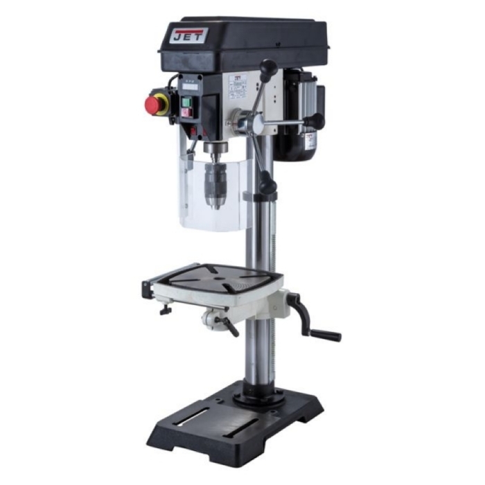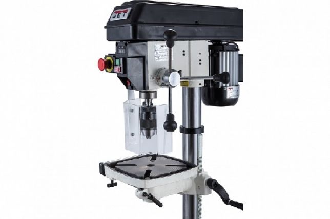 Настольный сверлильный станок Jet JWDP-12 - подходит для универсального (дерево и металл) применения. Основная отличительная черта этой модели – клиноременный вариатор, позволяющий плавно бесступенчато изменять скорость вращения шпинделя. Такая конструкция механизма ускоряет настройку в зависимости от диаметра сверления: вместо снятия и последующей установки ремня достаточно перевести рычаг, причем делают это, не выключая мотор. При этом фактическая скорость вращения шпинделя будет отображаться на цифровом дисплее, что особенно важно при работе с металлом, когда ограничения по частоте вращения режущего инструмента гораздо более строгие, чем при работе с деревом.