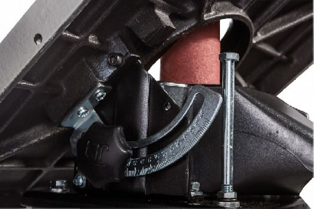 Мощный асинхронный двигатель рассчитан на продолжительную эксплуатацию, массивный корпус на резиновых опорах и тяжёлый чугунный стол хорошо поглощают вибрации. Есть механизм наклона стола на угол до 45°, чтобы шлифовать под углом.