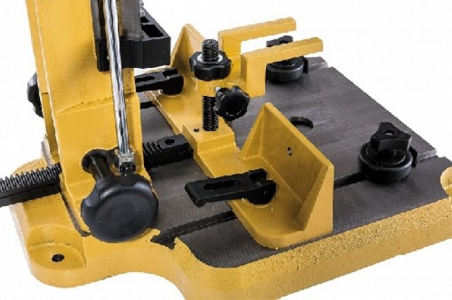 Чугунная колонна с долбежной частью жестко прикручена к чугунному же основанию, что обеспечивает прямые под углом ровно 90° края пазов без предварительных настроек и регулировок. Симметричное расположение крепежных отверстий позволяет переустановить колонну с поворотом на 180° так, чтобы работать от пола с дверными полотнами, оконными переплетами и другими крупными изделиями.