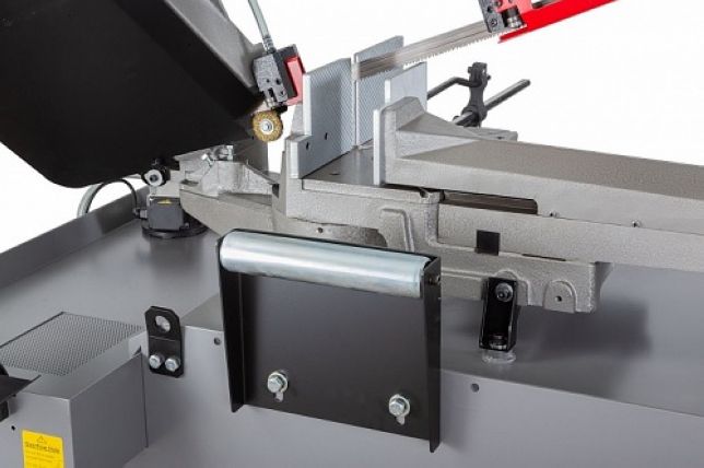 Пильная рама плавно опускается и поднимается, движение консоли управляется с пульта управления. Система гидравлики обеспечивает работу гидравлического прижима тисков, четко фиксирующих заготовку. Необходимая фиксация заготовки при пилении под разными углами, достигается путем переустановки левой части тисков.