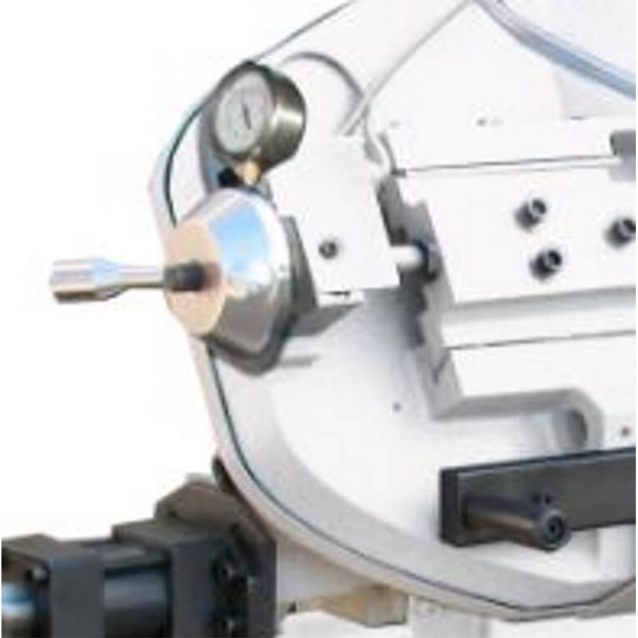 - Данная модель оснащена стационарными тисками с механизмом быстрой фиксации, для резки под углом, поворачивается рама, а не заготовка. Зажим заготовки осуществляется вручную, вращением маховика и поворотом рычага механизма быстрой фиксации, подача заготовки - также вручную.