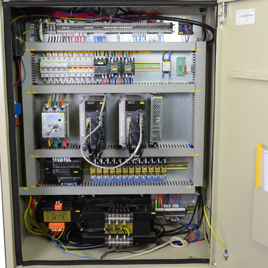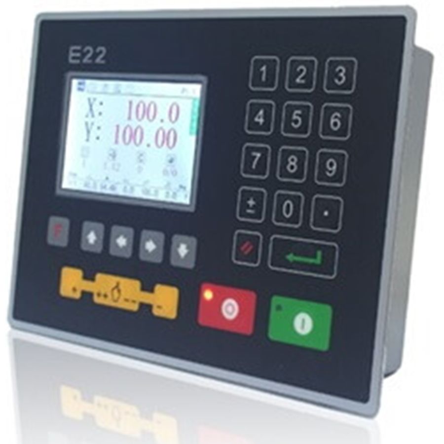 Станок оснащен двухосевым ЧПУ Estun E21. Управление по оси Y осуществляется ЧПУ путем задания положения механического упора, находящегося в гидроцилиндре. Это обеспечивает высокую точность и стабильность результата. Управление по оси X так же осуществляется ЧПУ, за что отвечает привод на базе мотор-редуктора с обратной связью и высокоточной ШВП с направляющими. Непосредственно правление приводами по осям производится частотным преобразователем.