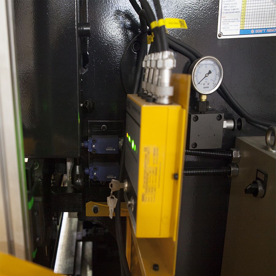 Станок оснащён - система управления Estun E21, алюминиевый рычаг с пультом управления, частотно-регулируемый привод, цифровое считывание по оси X/Y, предохранительный задний щиток и левый и правый боковые щитки, задний упор с силовым приводом с помощью шарико-винтовой передачи, основные электрические элементы Schneider, ножная педаль с аварийным остановом, верхний инструмент (пуансон) с функцией быстрого зажима, инвертор Schneider, передняя крышка со светодиодной лампой.