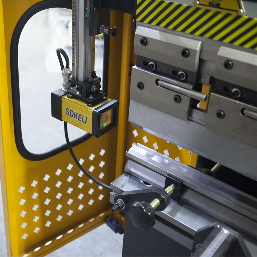 Регулировка по оси Y (ход траверсы) и X (ход заднего упора) осуществляется высокоточными двигателями от контроллера. Система позволяет отображать реальное положение осей станка и избавить оператора от вычислительных ошибок, возможность ввода значения математического ограничения движения механизмов (задних упоров и траверсы). Значения измеряемых координат отображаются на дисплее. Значение положения заднего упора гибочного станка поступает с датчика перемещения (энкодера), установленного на приводном винте ШВП. Положение траверсы гибочного станка отслеживается с помощью оптоэлектронных датчиков оптической линейки, установленной на станине станка (сигнал поступает на УЦИ преобразуясь в цифровое значение перемещения инструмента).