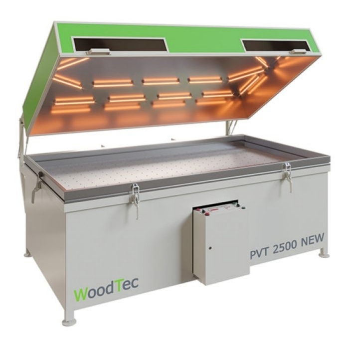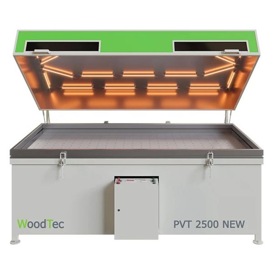 Пресс мембранно-вакуумный WoodTec PVT 2500 NEW - предназначена для облицовки пленками ПВХ дверных полотен и вставных филенок, мебельных и кухонных фасадов и других элементов корпусной мебели, а также панелей из композитных материалов с рельефной поверхностью. При облицовке используется нагрев и вакуумная технология. Загрузка заготовок, укладка пленки, подъем нагревательных элементов и разгрузка – ручная. Процесс прессования- автоматический. Применение Пресс применяется на предприятиях и в цехах по производству мебели, фасадов и дверей, а также в других деревообрабатывающих производств Технические особенности: