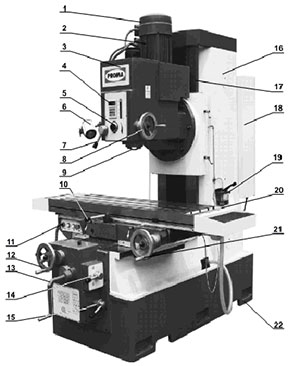 1.Электродвигатель привода шпинделя. 2.Электродвигатель подачи фрезерной головки. 3.Фрезерная головка. 4.Цифровой дисплей. 5.Регулятор вертикальной подачи. 6.Рабочее освещение. 7.Рукоятка зажима пиноли. 8.Штурвал пиноли шпинделя. 9.Шпиндель. 10.Переключатель продольной автоподачи стола. 11.Электрический блок управления. 12.Штурвал ручной поперечной подачи стола. 13.Рукоятка вертикального перемещения шпиндельной головки. 14.Переключатель поперечной автоподачи стола. 15.Переключатель скоростей. 16.Стойка вертикальная. 17.Направляющие вертикальной стойки. 18.Электрошкаф. 19.Маслёнка. 20.Стол. 21.Штурвал ручной продольной подачи стола. 22.Основание станины