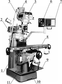 1. Станина. 2. Хобот. 3. Шпиндельная головка. 4. Электродвигатель. 5. Коробка скоростей. 6. Пульт управления. 7. Дисплей. 8. Стол. 9. Поддон. 10. Основание. 11. Консоль