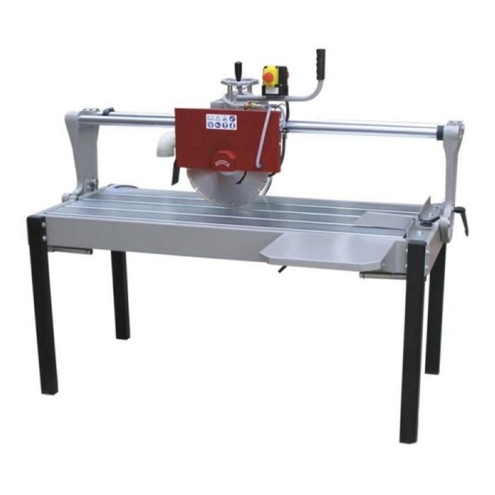 Станок отрезной Proma RD-1200S - предназначен для резки облицовочного и декоративного камня, тротуарной плитки и т.д. Его конструкция состоит из станины, на которой крепятся ножки и два поворотных кронштейна. Между кронштейнами установлены две направляющих, по которым перемещается пильный узел с электродвигателем, на валу которого крепится отрезной диск. На станине установлен стол для установки на него разрезаемого материала. На защитном кожухе отрезного диска установлен штуцер с подводом воды для охлаждения отрезного диска и лазерный светодиод для указания места реза. Электрический блок управления установлен на пильном узле.