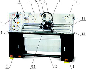 На левом конце станины крепится шпиндельная бабка 3 и коробка подач 2. В шпиндельной бабке находится коробка скоростей станка, основной частью которой является шпиндель. На шпинделе установлен зажимной патрон 4. Коробка подач 2 служит для передачи движения от коробки скоростей на ходовой вал 12 или ходовой винт 11. В корпусе шпиндельной установлен электрический блок управления.