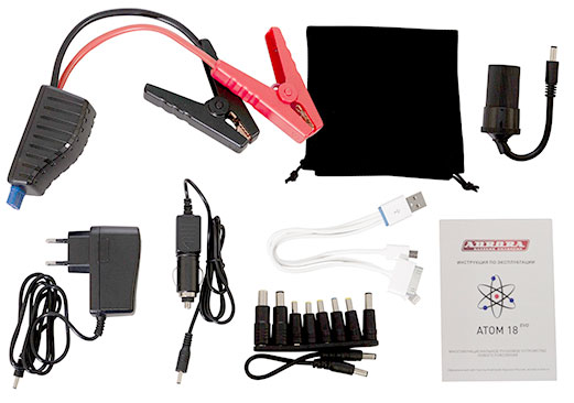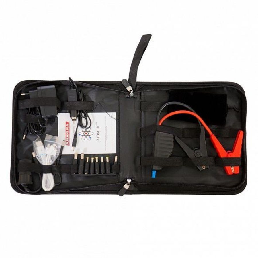 AURORA ATOM 18 EVOLUTION пригодится для запуска легковых автомобилей, мотоциклов, генераторов и других приборов, которые используют 12В аккумуляторы. Аппарат справится с запуском бензиновых (объемом 5-7 л) и дизельных (объемом до 4 л) двигателей. Прибор можно использовать для зарядки или питания различных мобильных гаджетов и портативных устройств, таких как телефоны, ноутбуки, планшеты и автохолодильники. Для удобства работы в плохо освещенных местах есть LED-фонарь, который обеспечит отличный обзор места работы. Фонарь имеет несколько режимов работы. Один из которых "SOS" (мигание фонаря). С его помощью вы можете подать сигнал для предупреждения других участников дорожного движения при неисправных световых приборах автомобиля.
