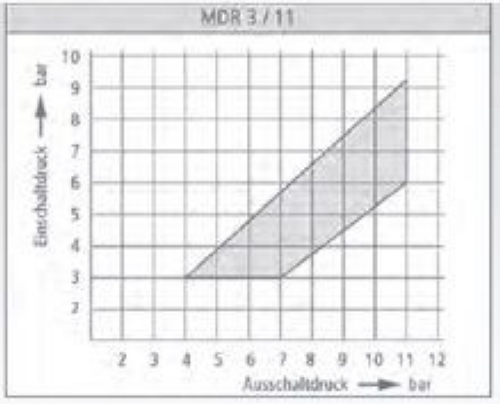Диапазон регулировки реле давления MDR 3 находится в заштрихованной области графика давления MDR 3