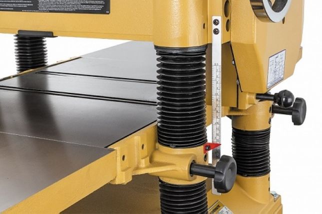 Станок имеет прочную, устойчивую к вибрациям, конструкцию на основе литых из чугуна деталей. Верхняя и нижняя части жестко связаны четырьмя цилиндрическими колоннами, по которым перемещается на направляющих рейсмусовый стол. В его центральной части установлены два регулируемых ролика для облегчения скольжения заготовки. Передняя и задняя секции тоже из чугуна, прикручены на болтах, имеют плоскую гладкую поверхность и роликами не оборудованы. Высота установки всего стола меняется вращением штурвала (маховика с рукояткой) и после настройки может быть дополнительно зафиксирована двумя стопорами со стяжными винтами.