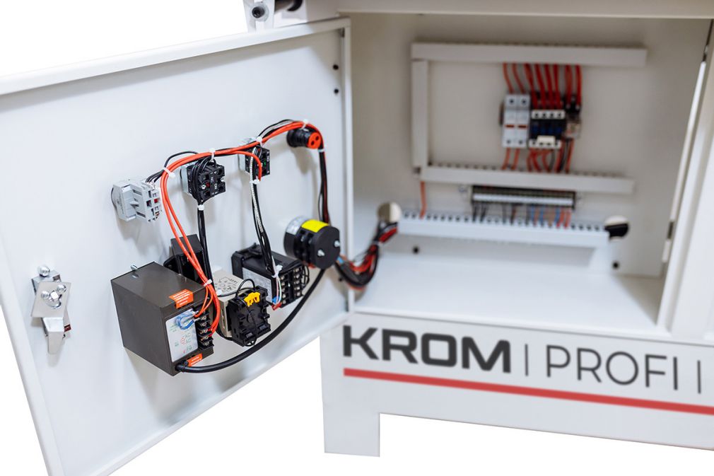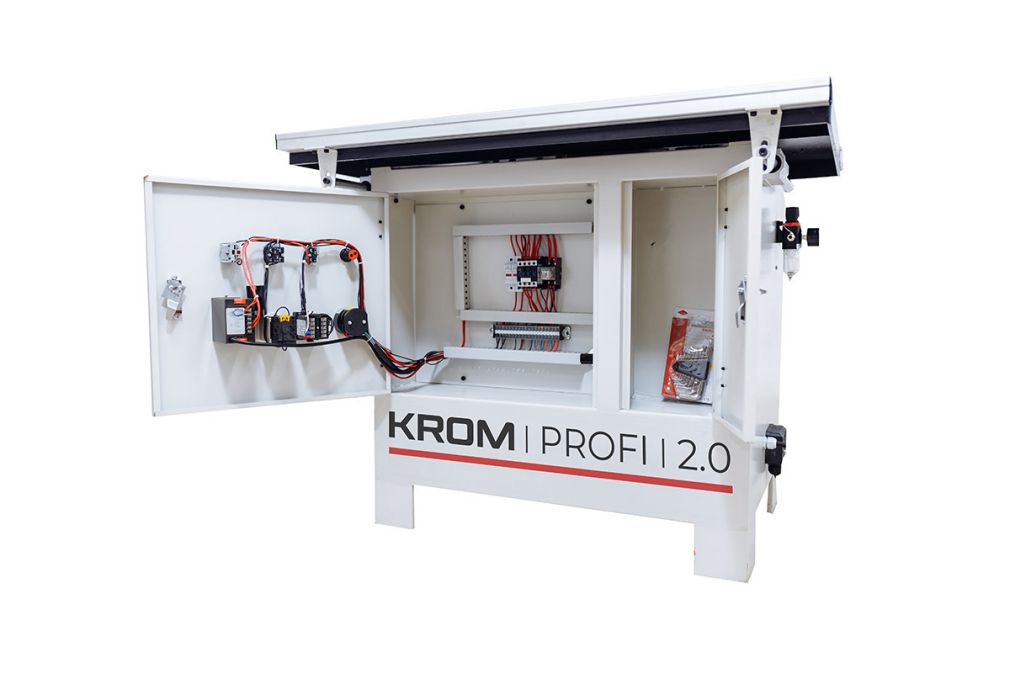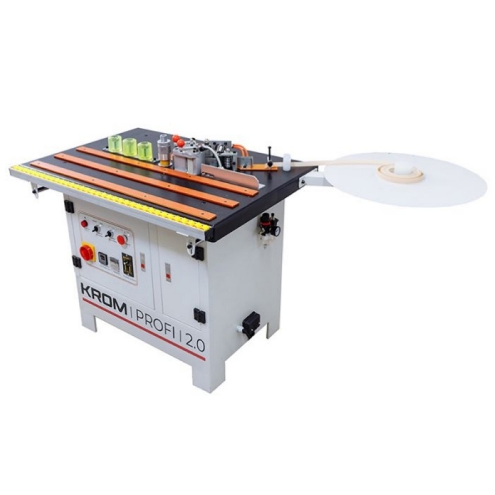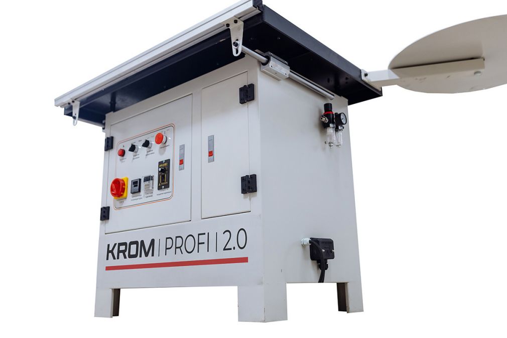 KROM PROFI 2.0 стационарный кромкооблицовочный станок, работающий от сети 220v и массой 120кг. С одинаково высоким качеством клеит весь тип и размер кромочного материала. Четко держит настройки, легко перенастраивается и понятен в управление. Хороший клеевой узел, возможно лучший в своем классе. Два клеевых вала обеспечивают одновременное нанесение на деталь и кромку. Оснащен пневматической гильотиной обрубки кромки, которая работает в двух режимах: прямые и криволинейные детали. Скорость подачи регулируется в диапазоне от 0 до 12 метров. Так же есть счетчик кромки, которым удобно пользоваться при большом количестве одинаковых деталей. Понимаем что фраза избита, но данная модель это действительно отличное сочетание цена — качество. Исключительно положительные отзывы клиентов. Пожалуй лучшее предложение на рынке России в сегменте «полноразмерный стационарный кромкооблицовочный станок». Рекомендуем всем кому нужна долгая и стабильная работа станка за адекватные деньги.