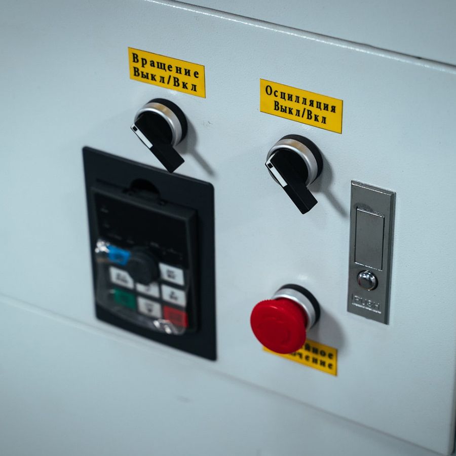 - Пульт управления представляет собой контролер для регулировки частоты вращения и выключатель для включения/выключения двигателя мотора вращения шлифовального узла, включение механизма осциляции и кнопку аварийной остановки.