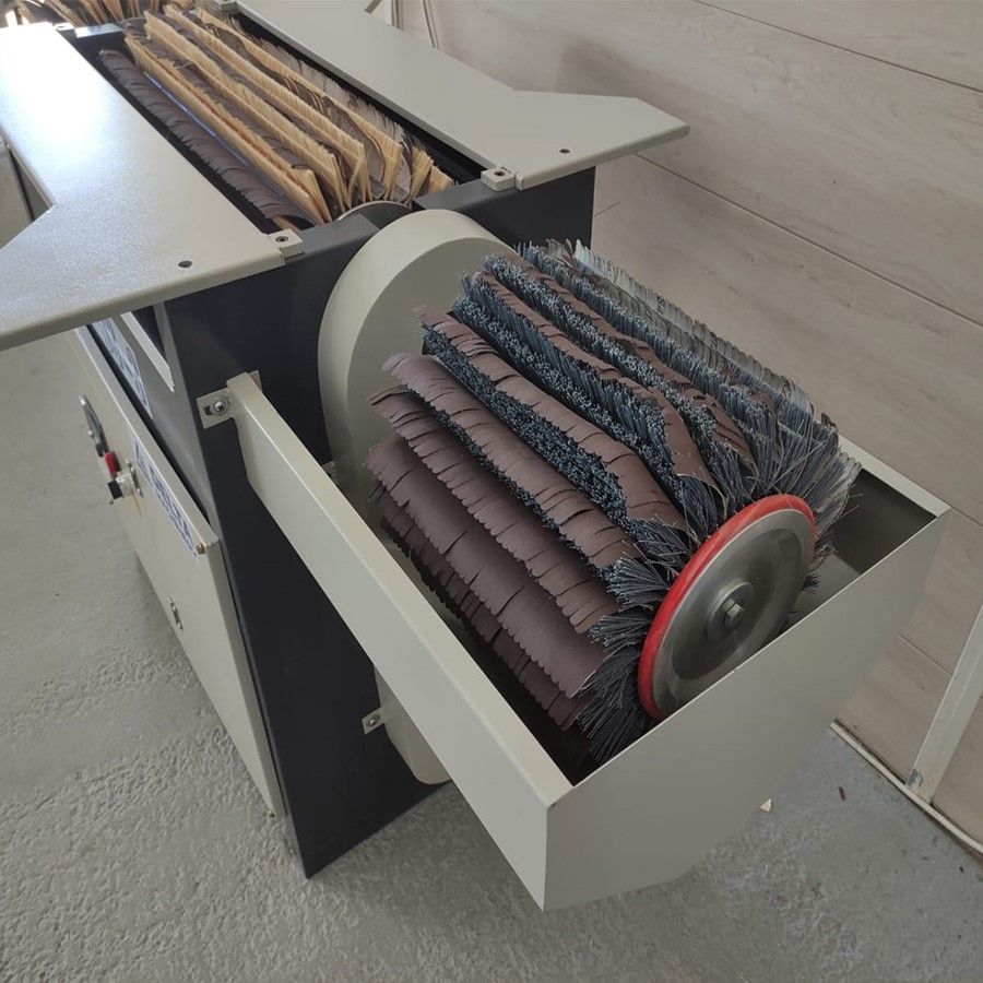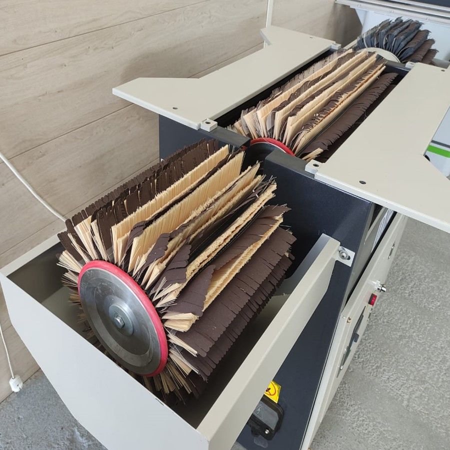 - Станок оснащен ТРЕМЯ горизонтальными барабанами. Простая и удобная смена абразивных вкладышей и поддерживающих сизалевых щеток.