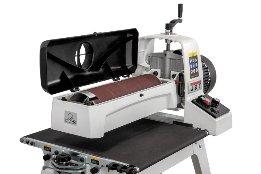 JWDS-1632-М укомплектован алюминиевым барабаном с намоткой из абразивной ленты. Замена производится быстро и просто. Доступ к узлу освобождается после откидывания кожуха-пылесборника, концы фиксируются прижимами-защелками, натяжение производится специальным пружинным устройством, которое компенсирует вытягивание ленты в процессе износа.