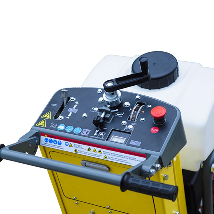 Конструкционная база с расширенным положением колес, для повышения устойчивости машины. Рабочая панель эргономична и удобна для управления. Есть счетчик моточасов, кнопка аварийной остановки, а также фиксатор положения рукоятки червячного механизма настройки глубины реза.