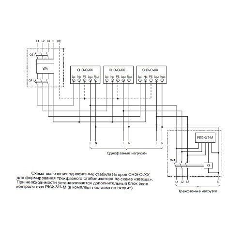 Для трехфазной сети (маркировка СНЭ-Т) необходимо три блока СНЭ-О, включенных по схеме «звезда».