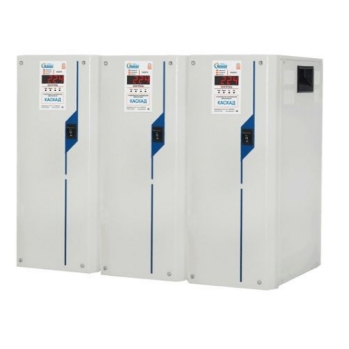 Стабилизатор электронный трехфазный Каскад СН-Т-45 - с микропроцессорным управлением предназначен для стабилизации напряжения в однофазных и трехфазных сетях 220/380 В 50 Гц (для трехфазной сети необходима установка трех стабилизаторов).