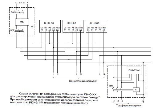 Для однофазной сети используется один стабилизатор, для трехфазной сети необходимо три стабилизатора, включенных по схеме «звезда».