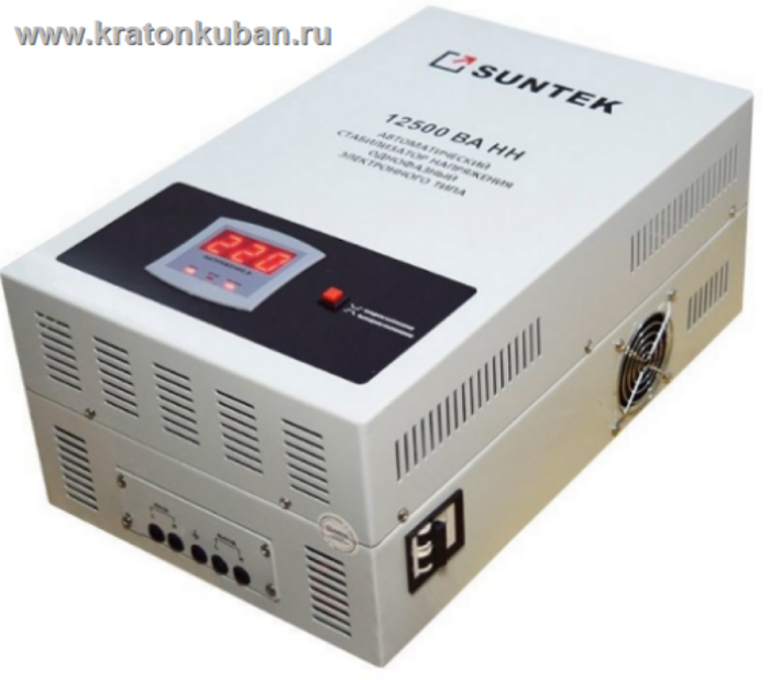 Стабилизатор напряжения Suntek-НН 11000 ВА в диапазоне 100-270 Вольт работает полноценно, полностью выравнивает напряжения на уровень допустимый ГОСТом без потери мощности! Табло показывает выходное напряжения 220 Вольт. Если, в результате дальнейшего падения напряжения (а это в диапазоне 90-100 Вольт), выходное напряжение становится меньше допустимого ГОСТом РФ, то табло уже показывает какое именно напряжение выходит из стабилизатора.