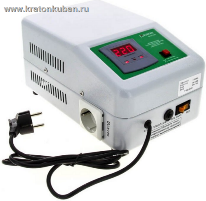 Стабилизатор напряжения Suntek РЛ 1500 ВА в диапазоне 140-270 Вольт работает полноценно полностью выравнивает напряжения на уровень допустимый ГОСТом без потери мощности! Табло показывает выходное напряжения 220 Вольт. Если, в результате дальнейшего падения напряжения (а это в диапазоне 120-140 Вольт), выходное напряжение становится меньше допустимого ГОСТом РФ, то табло уже показывает какое именно напряжение выходит из стабилизатора. При входном напряжении меньше 120 Вольт на табло загорается буква "L", но какое-то определенное время напряжение на выход стабилизатора еще поступает.