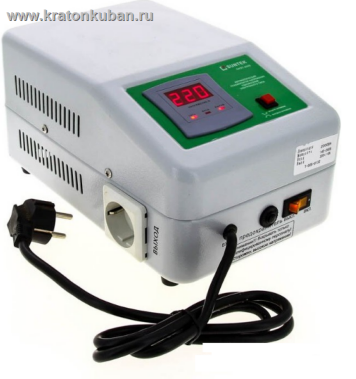 Стабилизатор напряжения Suntek РЛ 2000 ВА в диапазоне 140-270 Вольт работает полноценно полностью выравнивает напряжения на уровень допустимый ГОСТом без потери мощности! Табло показывает выходное напряжения 220 Вольт. Если, в результате дальнейшего падения напряжения (а это в диапазоне 120-140 Вольт), выходное напряжение становится меньше допустимого ГОСТом РФ, то уже табло показывает какое именно напряжение выходит из стабилизатора. При входном напряжении меньше 120 Вольт на табло загорается буква "L", но какое-то определенное время еще поступает напряжение на выход стабилизатора.