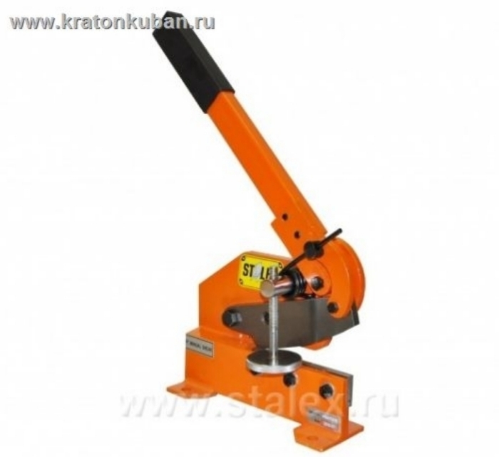 Вырубные ножницы Stalex HS-6 - прочный универсальный резчик для листовой, полосовой стали, а так же круглого прутка. Станок способен резать круглые заготовки диаметром до 11 мм, листовая сталь толщиной до 6 мм и полосы размером до 70х6 мм. Ножницы оснащены прочным прижимом, регулируемым по высоте и высококачественными режущими ножами.