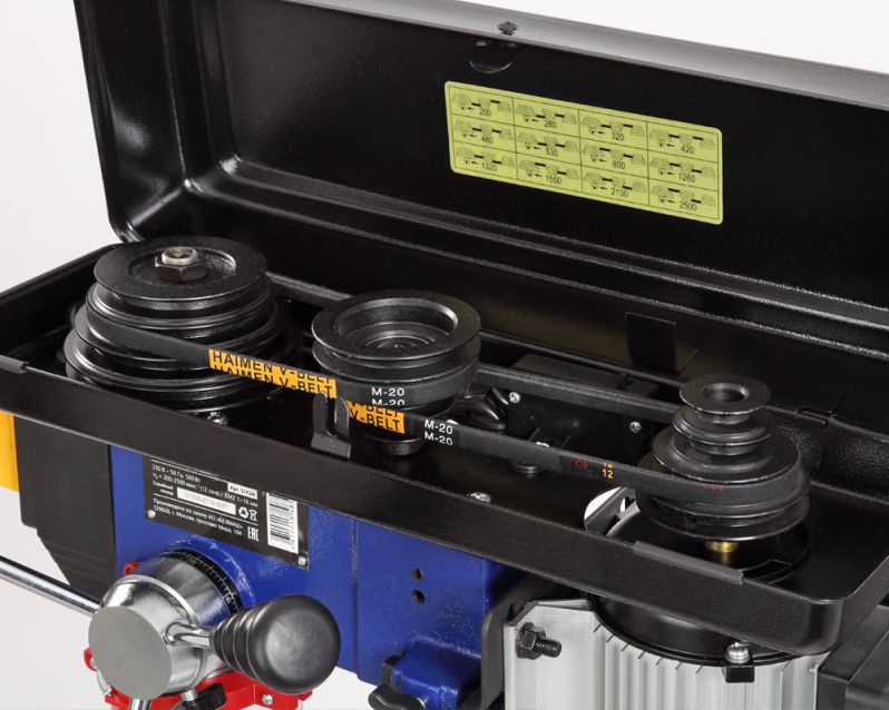 Имеется двенадцать ступеней скорости вращения шпинделя, что необходимо при выполнении различных операций и типах материала. Переключение производится за счет переброски ремней. Для этого необходимо открыть крышку ременного отсека, ослабить барашек крепления двигателя, тем самым получив возможность смещения шкива, перекинуть ремень и проделать операцию в обратной последовательности.