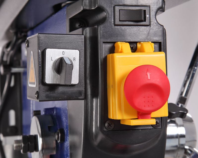 Заготовку можно крепить как к рабочему столу, так и к основанию, все зависит от ее размера. для точного позиционирования точки сверления, станок оснащен лазером - указателем. В комплекте предусмотрены тиски. Для их крепления есть четыре паза на рабочем столе и два на основании. Шкала, расположенная на рукоятке регулировки глубины сверления, показывает ход пиноли шпинделя, с ее помощью можно настраивать ход пиноли, для этого необходимо провернуть шкалу, стрелка на корпусе будет показывать значение, на которое будет возможно погружение сверла, затем затянуть барашек. Наконечники тройной рукояти удобной формы, что способствует плавной подаче сверла к заготовке.