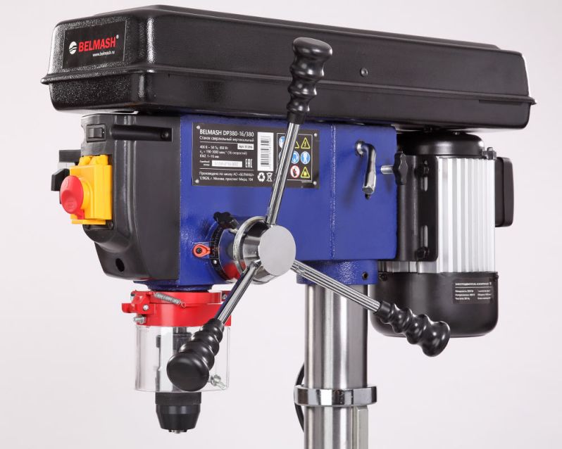 BELMASH DP380-16/380 – это самый мощный станок в модельном ряду – 850 Вт, рассчитанный на подключение к сети 400 В. Имеет широкий функционал. Стол, опора и корпус сверлильной головки выполнены из чугуна, что придает оборудованию серьезный вес - 55,7 килограмм. Станок высокий – 1155 мм, подходит для обработки заготовок большой толщины. Максимальное расстояние между шпинделем и столом – 480 мм.