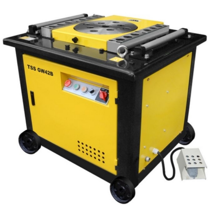 Станок для гибки арматуры с концевиком TSS GW 42В - высокотехнологичное оборудование, которое используется для холодной гибки арматурной стали, сортового проката на строительных площадках, под навесом, на производствах железобетонных и металлических конструкций, таких как дорожные плиты, блоки или панели перекрытий, а также в производственных цехах. Помимо этого, гибщики востребованы непосредственно в строительстве – например, при создании фундаментов будущих зданий. Благодаря использованию гибщиков арматуры удается существенно сократить время производства железобетонных изделий и конструкций, а также снизить трудозатраты. Простота в управлении и легкость регулировки нужного угла изгиба дают возможность быстро перенастроить станок для изготовления очередного вида изделий. Наличие педального и ручного управления способствует удобству работы оператора. Диск сгибания работает в режиме доводчика. Поставляемые модели оснащены всем необходимым и полностью готовы к использованию на предприятиях. На данном станке рекомендуется использовать масло минеральное SAE 15W40 SF/CC универсальное.