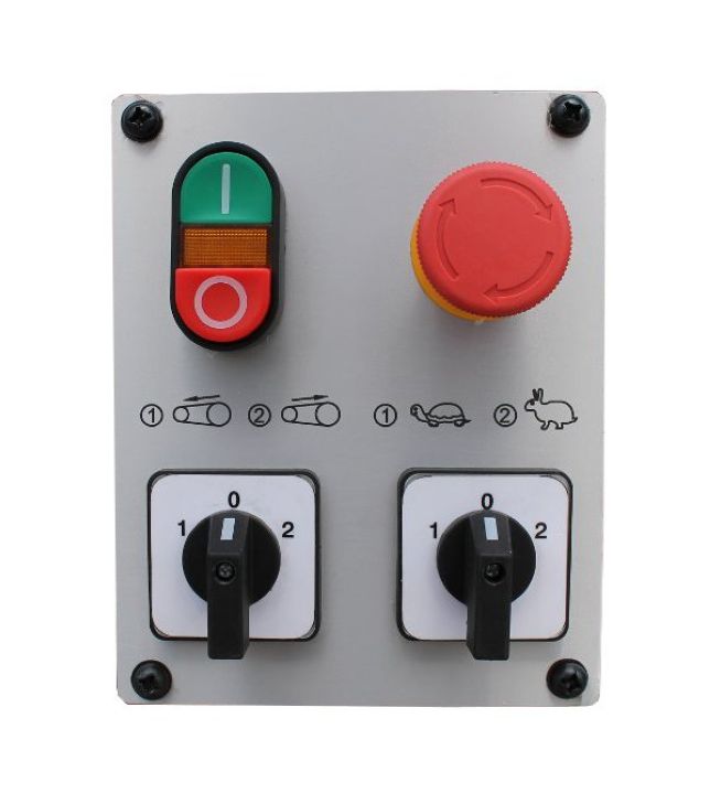- Панель управления размещена на стойке станка и имеет возможность регулировать скорость вращения ленты, а также изменять направление вращения ленты.