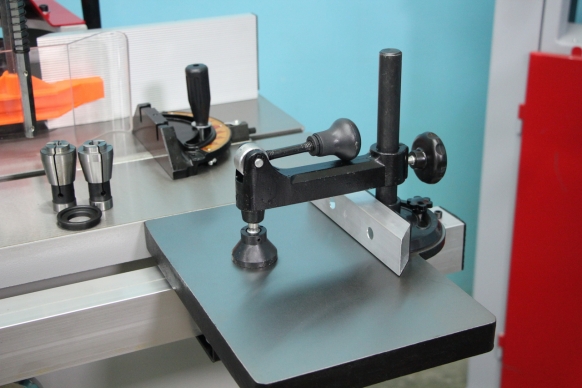 Для фрезерования криволинейных форм станок оснащен стартовым штифтом начального положения. Для обеспечения регулировки левая и правая щечки параллельного упора регулируются независимо.